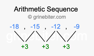 So, what type of sequence is -18, -15, -12, -9? The sequence -18, -15, -12, -9 has a common difference of +3 between each term. We call this kind of sequence an arithmetic sequence. Below is an image illustrating the correlation between the arithmetic sequence -18, -15, -12, -9 and its common difference of +3.