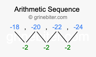 So, what type of sequence is -18, -20, -22, -24? The sequence -18, -20, -22, -24 has a common difference of -2 between each term. We call this kind of sequence an arithmetic sequence. Below is an image illustrating the correlation between the arithmetic sequence -18, -20, -22, -24 and its common difference of -2.