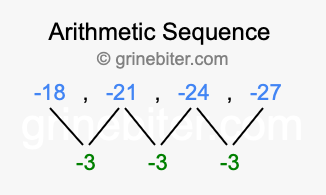 So, what type of sequence is -18, -21, -24, -27? The sequence -18, -21, -24, -27 has a common difference of -3 between each term. We call this kind of sequence an arithmetic sequence. Below is an image illustrating the correlation between the arithmetic sequence -18, -21, -24, -27 and its common difference of -3.