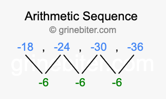 So, what type of sequence is -18, -24, -30, -36? The sequence -18, -24, -30, -36 has a common difference of -6 between each term. We call this kind of sequence an arithmetic sequence. Below is an image illustrating the correlation between the arithmetic sequence -18, -24, -30, -36 and its common difference of -6.