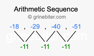 So, what type of sequence is -18, -29, -40, -51? The sequence -18, -29, -40, -51 has a common difference of -11 between each term. We call this kind of sequence an arithmetic sequence. Below is an image illustrating the correlation between the arithmetic sequence -18, -29, -40, -51 and its common difference of -11.