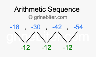 So, what type of sequence is -18, -30, -42, -54? The sequence -18, -30, -42, -54 has a common difference of -12 between each term. We call this kind of sequence an arithmetic sequence. Below is an image illustrating the correlation between the arithmetic sequence -18, -30, -42, -54 and its common difference of -12.