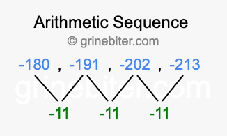 So, what type of sequence is -180, -191, -202, -213? The sequence -180, -191, -202, -213 has a common difference of -11 between each term. We call this kind of sequence an arithmetic sequence. Below is an image illustrating the correlation between the arithmetic sequence -180, -191, -202, -213 and its common difference of -11.