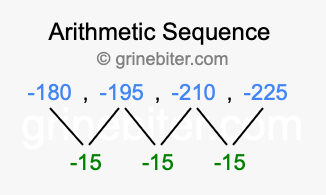 So, what type of sequence is -180, -195, -210, -225? The sequence -180, -195, -210, -225 has a common difference of -15 between each term. We call this kind of sequence an arithmetic sequence. Below is an image illustrating the correlation between the arithmetic sequence -180, -195, -210, -225 and its common difference of -15.