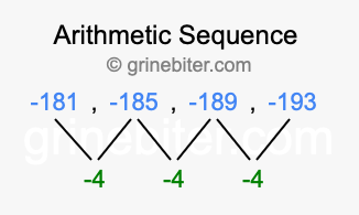 So, what type of sequence is -181, -185, -189, -193? The sequence -181, -185, -189, -193 has a common difference of -4 between each term. We call this kind of sequence an arithmetic sequence. Below is an image illustrating the correlation between the arithmetic sequence -181, -185, -189, -193 and its common difference of -4.