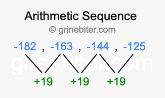 So, what type of sequence is -182, -163, -144, -125? The sequence -182, -163, -144, -125 has a common difference of +19 between each term. We call this kind of sequence an arithmetic sequence. Below is an image illustrating the correlation between the arithmetic sequence -182, -163, -144, -125 and its common difference of +19.