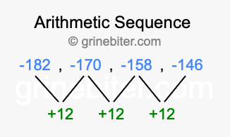 So, what type of sequence is -182, -170, -158, -146? The sequence -182, -170, -158, -146 has a common difference of +12 between each term. We call this kind of sequence an arithmetic sequence. Below is an image illustrating the correlation between the arithmetic sequence -182, -170, -158, -146 and its common difference of +12.