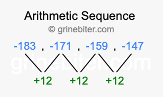 So, what type of sequence is -183, -171, -159, -147? The sequence -183, -171, -159, -147 has a common difference of +12 between each term. We call this kind of sequence an arithmetic sequence. Below is an image illustrating the correlation between the arithmetic sequence -183, -171, -159, -147 and its common difference of +12.