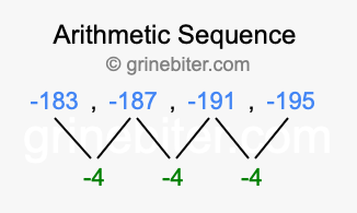 So, what type of sequence is -183, -187, -191, -195? The sequence -183, -187, -191, -195 has a common difference of -4 between each term. We call this kind of sequence an arithmetic sequence. Below is an image illustrating the correlation between the arithmetic sequence -183, -187, -191, -195 and its common difference of -4.