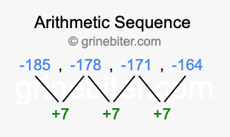 So, what type of sequence is -185, -178, -171, -164? The sequence -185, -178, -171, -164 has a common difference of +7 between each term. We call this kind of sequence an arithmetic sequence. Below is an image illustrating the correlation between the arithmetic sequence -185, -178, -171, -164 and its common difference of +7.