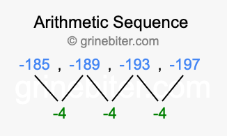 So, what type of sequence is -185, -189, -193, -197? The sequence -185, -189, -193, -197 has a common difference of -4 between each term. We call this kind of sequence an arithmetic sequence. Below is an image illustrating the correlation between the arithmetic sequence -185, -189, -193, -197 and its common difference of -4.