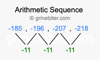 So, what type of sequence is -185, -196, -207, -218? The sequence -185, -196, -207, -218 has a common difference of -11 between each term. We call this kind of sequence an arithmetic sequence. Below is an image illustrating the correlation between the arithmetic sequence -185, -196, -207, -218 and its common difference of -11.