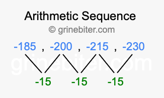 So, what type of sequence is -185, -200, -215, -230? The sequence -185, -200, -215, -230 has a common difference of -15 between each term. We call this kind of sequence an arithmetic sequence. Below is an image illustrating the correlation between the arithmetic sequence -185, -200, -215, -230 and its common difference of -15.