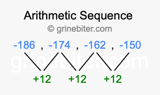 So, what type of sequence is -186, -174, -162, -150? The sequence -186, -174, -162, -150 has a common difference of +12 between each term. We call this kind of sequence an arithmetic sequence. Below is an image illustrating the correlation between the arithmetic sequence -186, -174, -162, -150 and its common difference of +12.