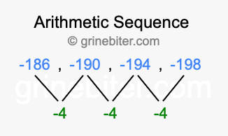 So, what type of sequence is -186, -190, -194, -198? The sequence -186, -190, -194, -198 has a common difference of -4 between each term. We call this kind of sequence an arithmetic sequence. Below is an image illustrating the correlation between the arithmetic sequence -186, -190, -194, -198 and its common difference of -4.