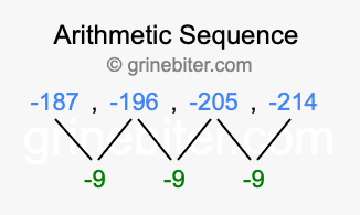 So, what type of sequence is -187, -196, -205, -214? The sequence -187, -196, -205, -214 has a common difference of -9 between each term. We call this kind of sequence an arithmetic sequence. Below is an image illustrating the correlation between the arithmetic sequence -187, -196, -205, -214 and its common difference of -9.