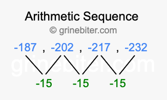 So, what type of sequence is -187, -202, -217, -232? The sequence -187, -202, -217, -232 has a common difference of -15 between each term. We call this kind of sequence an arithmetic sequence. Below is an image illustrating the correlation between the arithmetic sequence -187, -202, -217, -232 and its common difference of -15.