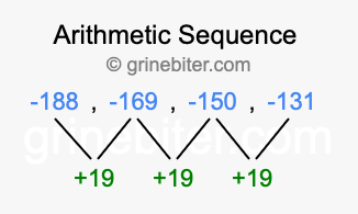 So, what type of sequence is -188, -169, -150, -131? The sequence -188, -169, -150, -131 has a common difference of +19 between each term. We call this kind of sequence an arithmetic sequence. Below is an image illustrating the correlation between the arithmetic sequence -188, -169, -150, -131 and its common difference of +19.