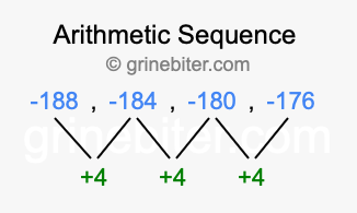 So, what type of sequence is -188, -184, -180, -176? The sequence -188, -184, -180, -176 has a common difference of +4 between each term. We call this kind of sequence an arithmetic sequence. Below is an image illustrating the correlation between the arithmetic sequence -188, -184, -180, -176 and its common difference of +4.