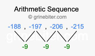So, what type of sequence is -188, -197, -206, -215? The sequence -188, -197, -206, -215 has a common difference of -9 between each term. We call this kind of sequence an arithmetic sequence. Below is an image illustrating the correlation between the arithmetic sequence -188, -197, -206, -215 and its common difference of -9.