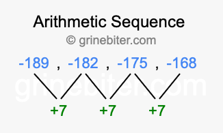 So, what type of sequence is -189, -182, -175, -168? The sequence -189, -182, -175, -168 has a common difference of +7 between each term. We call this kind of sequence an arithmetic sequence. Below is an image illustrating the correlation between the arithmetic sequence -189, -182, -175, -168 and its common difference of +7.