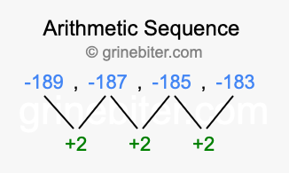 So, what type of sequence is -189, -187, -185, -183? The sequence -189, -187, -185, -183 has a common difference of +2 between each term. We call this kind of sequence an arithmetic sequence. Below is an image illustrating the correlation between the arithmetic sequence -189, -187, -185, -183 and its common difference of +2.