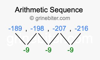 So, what type of sequence is -189, -198, -207, -216? The sequence -189, -198, -207, -216 has a common difference of -9 between each term. We call this kind of sequence an arithmetic sequence. Below is an image illustrating the correlation between the arithmetic sequence -189, -198, -207, -216 and its common difference of -9.