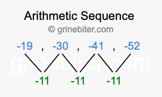 So, what type of sequence is -19, -30, -41, -52? The sequence -19, -30, -41, -52 has a common difference of -11 between each term. We call this kind of sequence an arithmetic sequence. Below is an image illustrating the correlation between the arithmetic sequence -19, -30, -41, -52 and its common difference of -11.