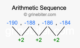 So, what type of sequence is -190, -188, -186, -184? The sequence -190, -188, -186, -184 has a common difference of +2 between each term. We call this kind of sequence an arithmetic sequence. Below is an image illustrating the correlation between the arithmetic sequence -190, -188, -186, -184 and its common difference of +2.