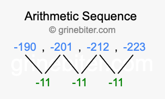 So, what type of sequence is -190, -201, -212, -223? The sequence -190, -201, -212, -223 has a common difference of -11 between each term. We call this kind of sequence an arithmetic sequence. Below is an image illustrating the correlation between the arithmetic sequence -190, -201, -212, -223 and its common difference of -11.