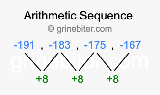 So, what type of sequence is -191, -183, -175, -167? The sequence -191, -183, -175, -167 has a common difference of +8 between each term. We call this kind of sequence an arithmetic sequence. Below is an image illustrating the correlation between the arithmetic sequence -191, -183, -175, -167 and its common difference of +8.