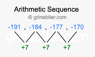 So, what type of sequence is -191, -184, -177, -170? The sequence -191, -184, -177, -170 has a common difference of +7 between each term. We call this kind of sequence an arithmetic sequence. Below is an image illustrating the correlation between the arithmetic sequence -191, -184, -177, -170 and its common difference of +7.