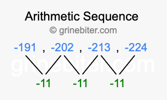 So, what type of sequence is -191, -202, -213, -224? The sequence -191, -202, -213, -224 has a common difference of -11 between each term. We call this kind of sequence an arithmetic sequence. Below is an image illustrating the correlation between the arithmetic sequence -191, -202, -213, -224 and its common difference of -11.