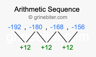 So, what type of sequence is -192, -180, -168, -156? The sequence -192, -180, -168, -156 has a common difference of +12 between each term. We call this kind of sequence an arithmetic sequence. Below is an image illustrating the correlation between the arithmetic sequence -192, -180, -168, -156 and its common difference of +12.