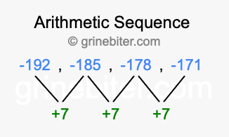 So, what type of sequence is -192, -185, -178, -171? The sequence -192, -185, -178, -171 has a common difference of +7 between each term. We call this kind of sequence an arithmetic sequence. Below is an image illustrating the correlation between the arithmetic sequence -192, -185, -178, -171 and its common difference of +7.