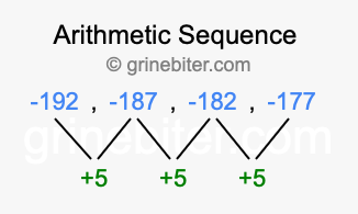 So, what type of sequence is -192, -187, -182, -177? The sequence -192, -187, -182, -177 has a common difference of +5 between each term. We call this kind of sequence an arithmetic sequence. Below is an image illustrating the correlation between the arithmetic sequence -192, -187, -182, -177 and its common difference of +5.