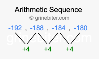 So, what type of sequence is -192, -188, -184, -180? The sequence -192, -188, -184, -180 has a common difference of +4 between each term. We call this kind of sequence an arithmetic sequence. Below is an image illustrating the correlation between the arithmetic sequence -192, -188, -184, -180 and its common difference of +4.