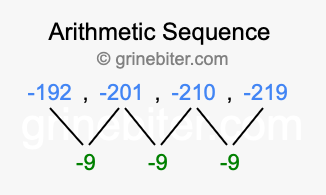 So, what type of sequence is -192, -201, -210, -219? The sequence -192, -201, -210, -219 has a common difference of -9 between each term. We call this kind of sequence an arithmetic sequence. Below is an image illustrating the correlation between the arithmetic sequence -192, -201, -210, -219 and its common difference of -9.
