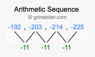 So, what type of sequence is -192, -203, -214, -225? The sequence -192, -203, -214, -225 has a common difference of -11 between each term. We call this kind of sequence an arithmetic sequence. Below is an image illustrating the correlation between the arithmetic sequence -192, -203, -214, -225 and its common difference of -11.