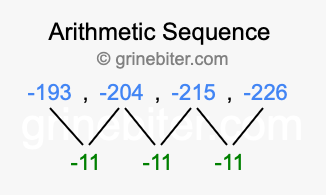 So, what type of sequence is -193, -204, -215, -226? The sequence -193, -204, -215, -226 has a common difference of -11 between each term. We call this kind of sequence an arithmetic sequence. Below is an image illustrating the correlation between the arithmetic sequence -193, -204, -215, -226 and its common difference of -11.