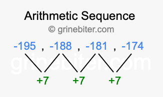 So, what type of sequence is -195, -188, -181, -174? The sequence -195, -188, -181, -174 has a common difference of +7 between each term. We call this kind of sequence an arithmetic sequence. Below is an image illustrating the correlation between the arithmetic sequence -195, -188, -181, -174 and its common difference of +7.