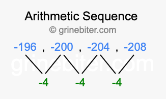 So, what type of sequence is -196, -200, -204, -208? The sequence -196, -200, -204, -208 has a common difference of -4 between each term. We call this kind of sequence an arithmetic sequence. Below is an image illustrating the correlation between the arithmetic sequence -196, -200, -204, -208 and its common difference of -4.