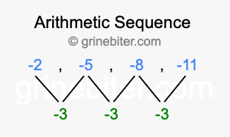 So, what type of sequence is -2, -5, -8, -11? The sequence -2, -5, -8, -11 has a common difference of -3 between each term. We call this kind of sequence an arithmetic sequence. Below is an image illustrating the correlation between the arithmetic sequence -2, -5, -8, -11 and its common difference of -3.