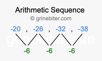 So, what type of sequence is -20, -26, -32, -38? The sequence -20, -26, -32, -38 has a common difference of -6 between each term. We call this kind of sequence an arithmetic sequence. Below is an image illustrating the correlation between the arithmetic sequence -20, -26, -32, -38 and its common difference of -6.
