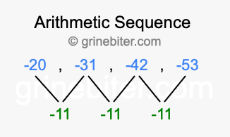 So, what type of sequence is -20, -31, -42, -53? The sequence -20, -31, -42, -53 has a common difference of -11 between each term. We call this kind of sequence an arithmetic sequence. Below is an image illustrating the correlation between the arithmetic sequence -20, -31, -42, -53 and its common difference of -11.