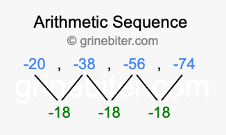 So, what type of sequence is -20, -38, -56, -74? The sequence -20, -38, -56, -74 has a common difference of -18 between each term. We call this kind of sequence an arithmetic sequence. Below is an image illustrating the correlation between the arithmetic sequence -20, -38, -56, -74 and its common difference of -18.