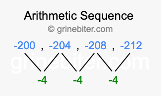 So, what type of sequence is -200, -204, -208, -212? The sequence -200, -204, -208, -212 has a common difference of -4 between each term. We call this kind of sequence an arithmetic sequence. Below is an image illustrating the correlation between the arithmetic sequence -200, -204, -208, -212 and its common difference of -4.