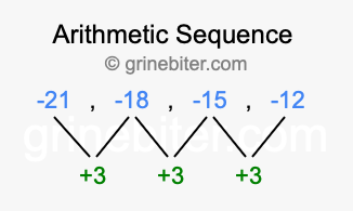 So, what type of sequence is -21, -18, -15, -12? The sequence -21, -18, -15, -12 has a common difference of +3 between each term. We call this kind of sequence an arithmetic sequence. Below is an image illustrating the correlation between the arithmetic sequence -21, -18, -15, -12 and its common difference of +3.