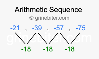 So, what type of sequence is -21, -39, -57, -75? The sequence -21, -39, -57, -75 has a common difference of -18 between each term. We call this kind of sequence an arithmetic sequence. Below is an image illustrating the correlation between the arithmetic sequence -21, -39, -57, -75 and its common difference of -18.