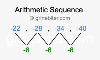 So, what type of sequence is -22, -28, -34, -40? The sequence -22, -28, -34, -40 has a common difference of -6 between each term. We call this kind of sequence an arithmetic sequence. Below is an image illustrating the correlation between the arithmetic sequence -22, -28, -34, -40 and its common difference of -6.